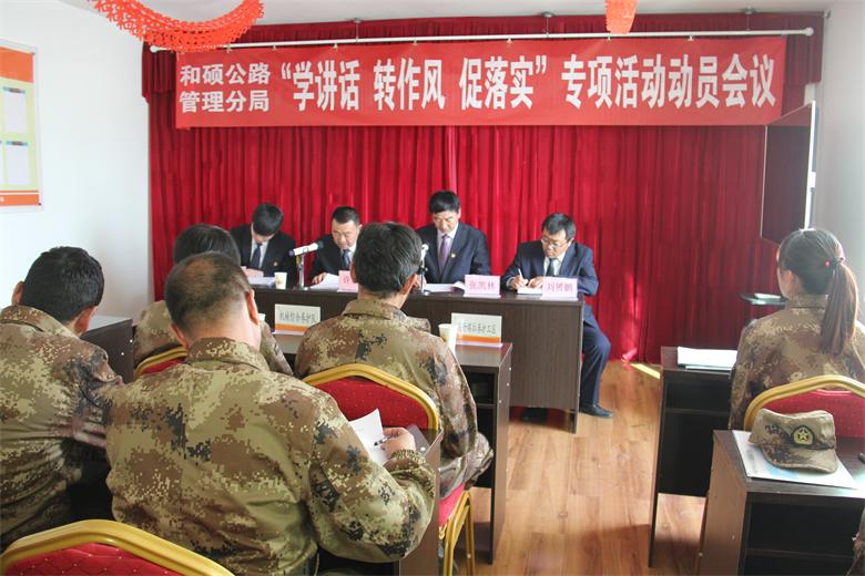 3月21日,召开“学讲话、转作风、促落实”专项活动动员大会,和硕公路管理分局全体干部职工参会。会议要求,全体干部职工要切实增强核心意识、看齐意识,围绕总目标,落实总目标,持续深入开展“民族团结一家亲”、“去极端化”宣讲等活动,深入学习党的十八届六中全会、习近平总书记系列重要讲话特别是在第二次中央新疆工作座谈会上的重要讲话、视察新疆时的重要讲话精神,要在转变作风上持续用劲用力,牢固树立“作风不实是我们最大的敌人”的理念,以高的标准、严的要求,锲而不舍、扭住不放,坚决纠治在改革发展稳定工作中存在的作风问题;要聚焦总目标,狠抓各项工作措施的落实,确保中央治疆方略落地生根。