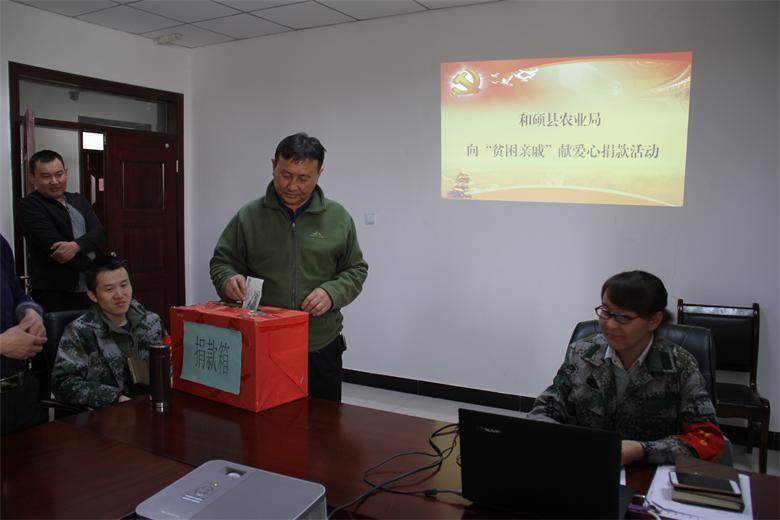 近日,和硕县农业局组织全局干部职工开展了向“贫困亲戚”献爱心捐款活动。此次爱心捐款行动一经发起,便得到了全体干部职工的积极响应,全体工作人员在局领导的带领下,纷纷踊跃捐款,伸出援助之手。