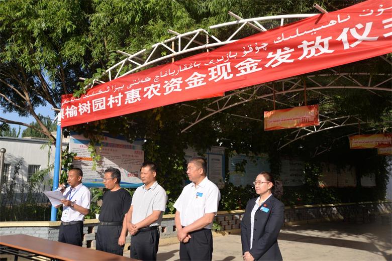 5月29日周一早上7点半,在和硕县曲惠乡榆树园村委会大院里,和硕县财政局刘鹏局长带领10名财政干部早早地排好队等待“升国旗、讲政策、发补贴”。
