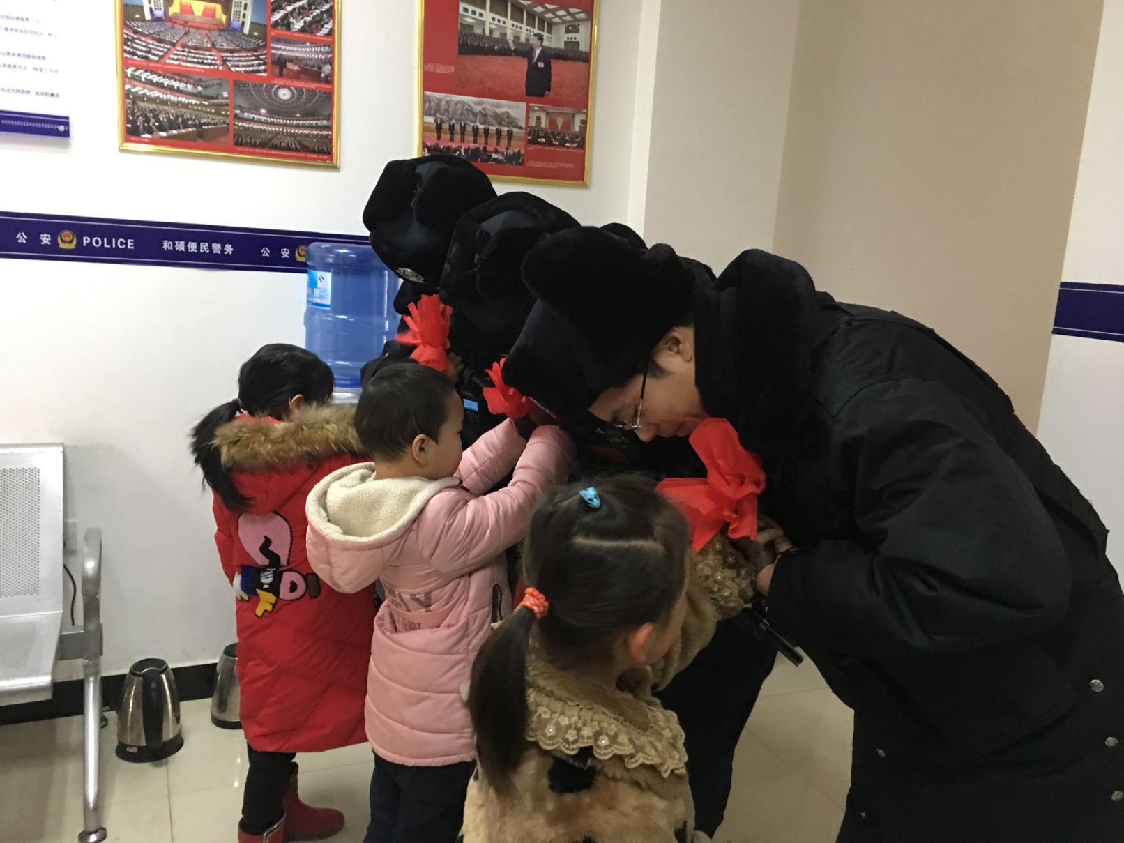 2018年1月12日上午,和硕县007号警务站里热闹非凡,民警们接待了一批特殊的客人,他们是和硕县幼儿园的老师和小朋友。“警察叔叔辛苦了!这个大红花送给你。”孩子们将自己亲手做的大红花送给民警们,感谢警察叔叔风雨无阻地为幼儿园护校执勤,为小朋友创造了安全、畅通的上下学环境。