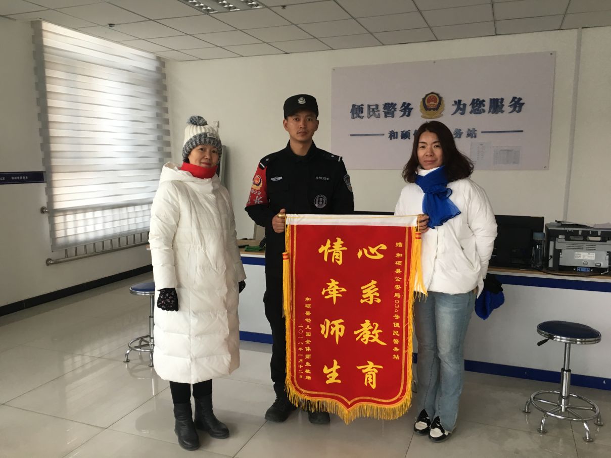 近日,和硕县幼儿园园领导一行代表全园教职工,满怀感激之情将一面写有“园丁贴心人,花朵守护神”的鲜红锦旗送到幼儿园附近警务站站长巴音查汗手中,感谢警务站民警在过去的一年里为幼儿园广大师生营造了安全育人的良好环境。