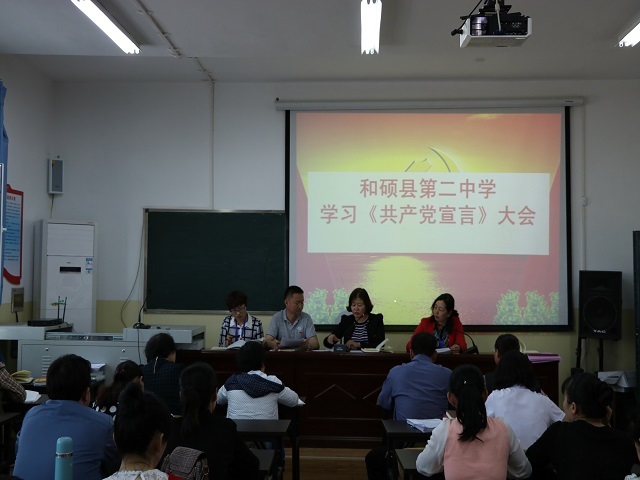 为纪念《共产党宣言》发表170周年,马克思诞辰200周年。4月28日下午,和硕县第二中学响应党中央“不忘初心、牢记使命”的号召,集体全文学习了这一纲领性文献。
