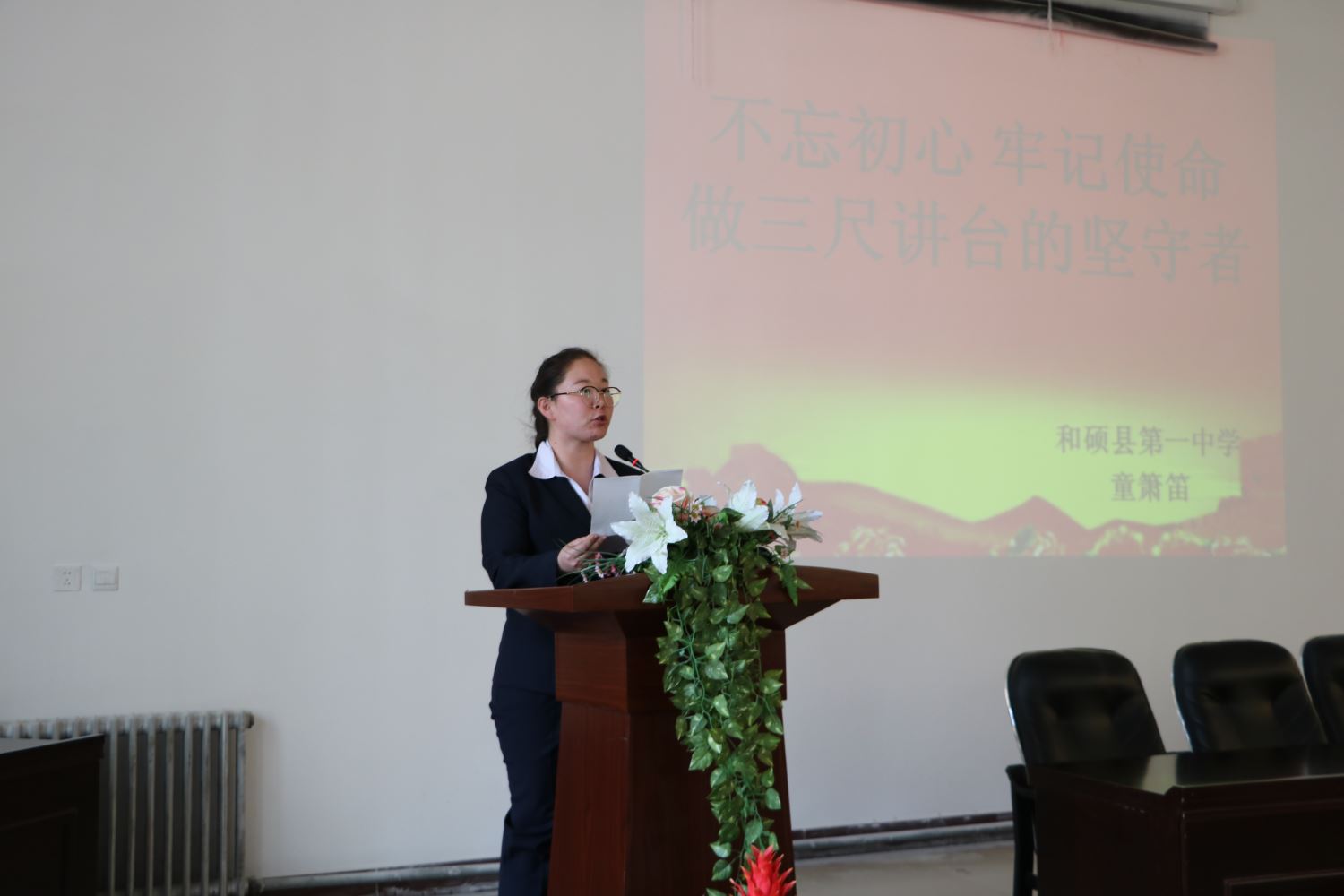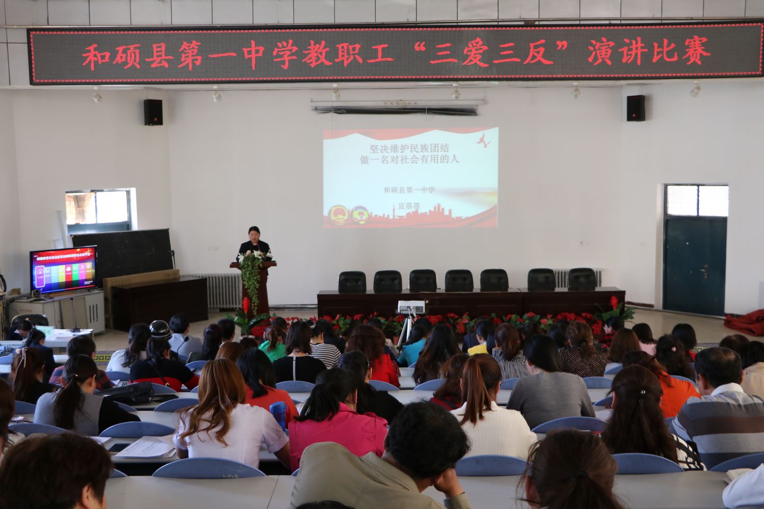 为全面贯彻党的十九大精神,在广大教职工中深入开展“三爱”主题教育实践活动,激发广大教职工努力工作、甘于奉献、爱岗敬业的师德精神动力,从而投身到学校各项事业发展的伟大实践中去。充分发挥课堂主渠道作用,将“三爱”教育始终贯穿于学校教育教学活动中,促使广大师生不断增强爱国情怀和民族自豪感,凝聚起推进新疆社会稳定和长治久安的强大合力,5月3日下午,和硕县第一中学组织全体教职工开展了“三爱三反”演讲比赛。
