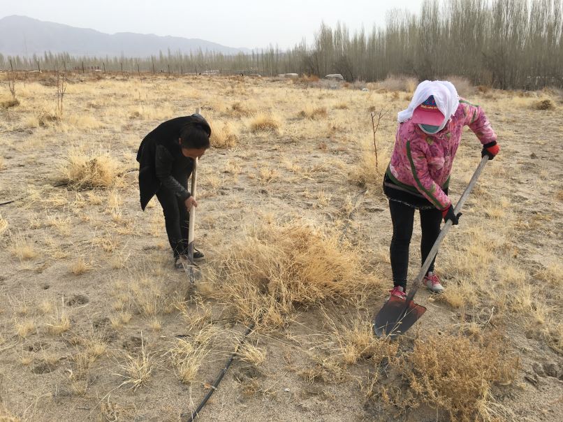 3月30日下午,和硕县住建局驻乌什塔拉乡沙梁湾村工作队和村“两委”带领20余名贫困人员到该村欧洲李扶贫基地进行锄草活动。