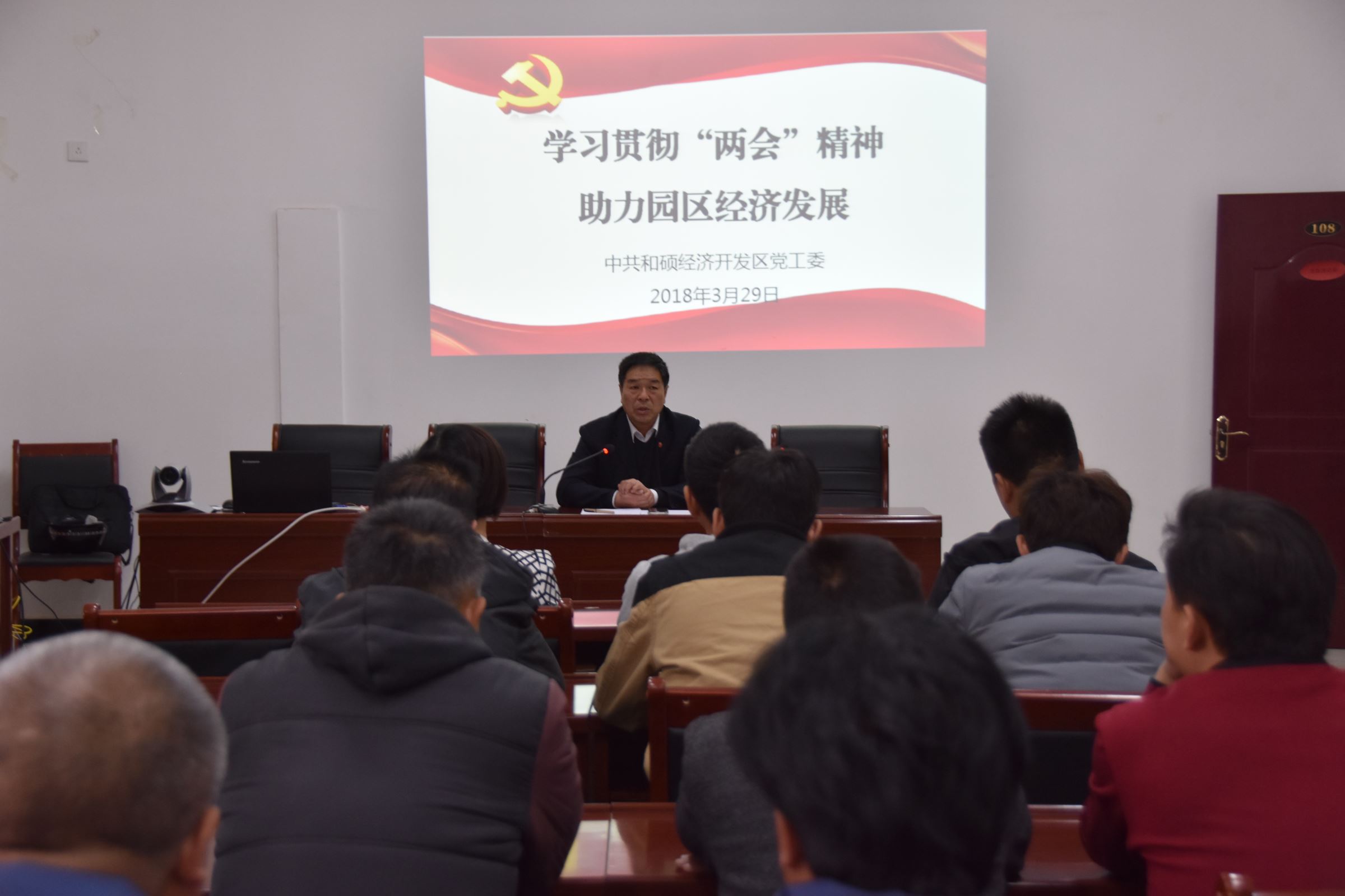 3月29日,和硕经济开发区党工委书记、管委会副主任楚洪涛主持召开会议传达贯彻落实全国“两会”精神。和硕经济开发区党工委、管委会领导班子成员、全体工作人员,各企业负责人参加会议。
