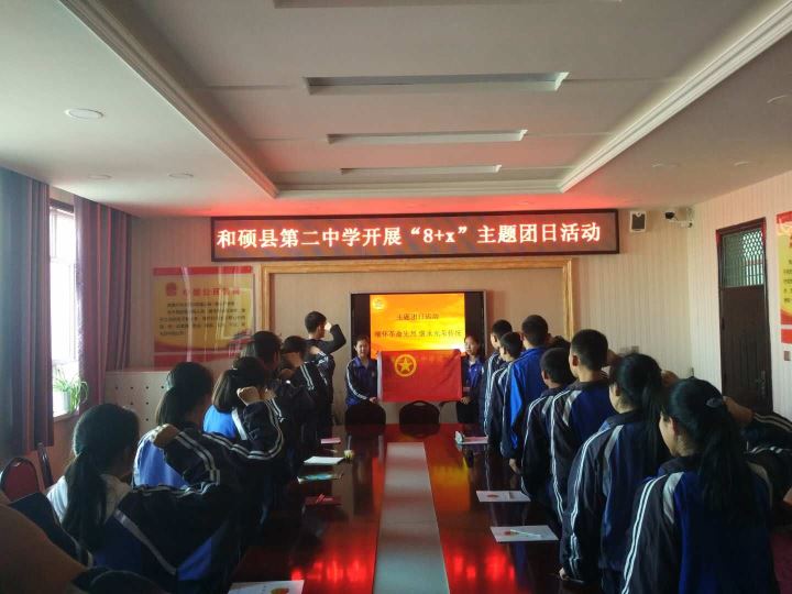 为深入贯彻落实党的十九大精神,在深化从严治团和“一学一做”教育实践常态化中加强团建工作,建强基层团组织,夯实团的基层基础,切实增强广大团员青年的“四个意识”,充分发挥各级团组织的生力军和突击队作用,团结凝聚广大团员青年为贯彻落实社会稳定和长治久安总目标作出积极贡献。3月30日,和硕县第二中学开展了“8+X”主题团日活动,通过唱国歌、诵团章、重温入团誓词、交团费、唱团歌、发声亮剑等系列活动。活动由九年级(2)班团支部书记马丹妮主持。