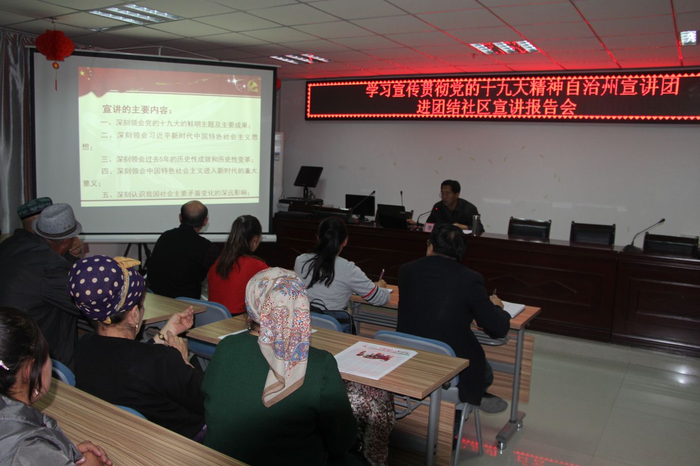 11月17日晚20:30,自治州宣讲团宣讲团来社区宣讲党的十九大精神,宣讲报告会场场爆满,掀起了团结社区夜校学习宣传贯彻十九大精神的热潮。