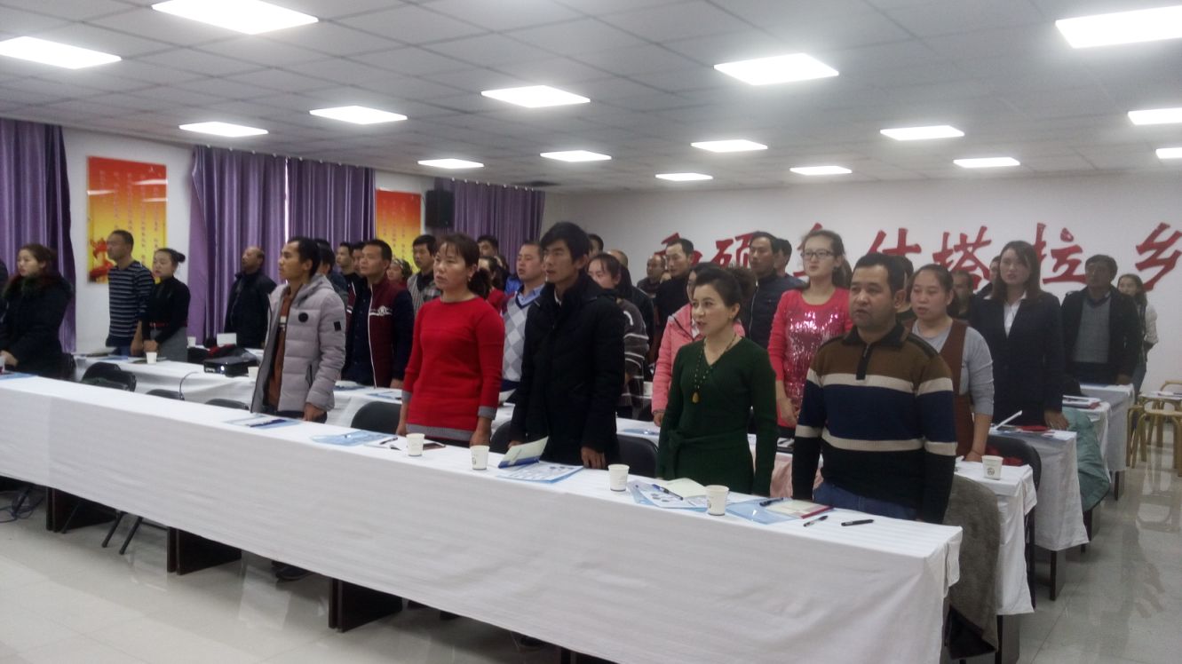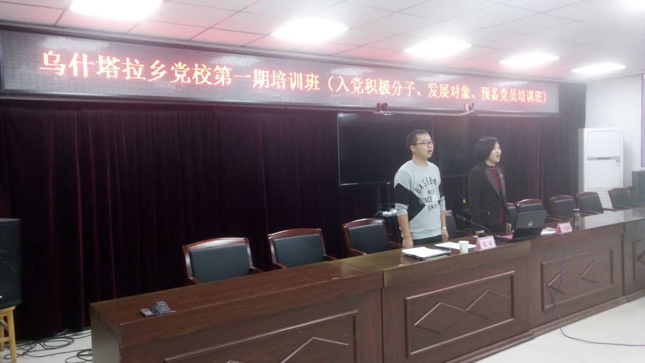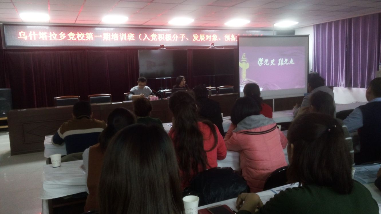 乌什塔拉乡党校第一期培训班已于20171218日开班,我乡7个村1个社区共计60余名入党积极分子、发展对象、预备党员参加了开班仪式。随后,县委副书记、乡党委书记牛曼玲同志为参训人员上了题为《学党史 跟党走》的党课,和参训人员一起回顾了党的一大到十九大的光辉历史,坚定了共产党人的初心和使命,更坚定了大家听党话、跟党走的信心和决心。乡党委委员、组织干事张涛同志就发展党员的5个阶段、25个流程向大家做了培训。下午,60余名入党积极分子、发展对象和预备党员现场撰写学习心得体会,并进行了培训测试。