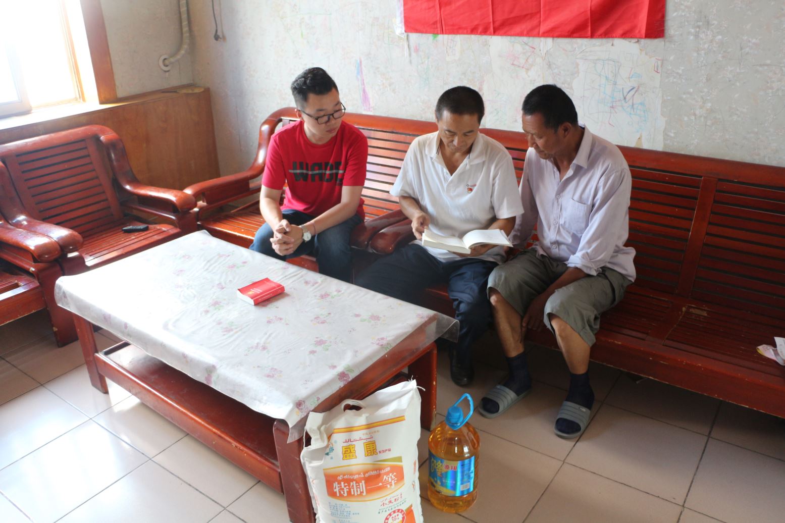 图2:6月28日,和硕县国税局驻龙驹社区工作队看望35年党龄的老党员刘玉升,副队长王强、队员刘虎并宣讲《习近平新时代中国特色社会主义思想三十讲》内容